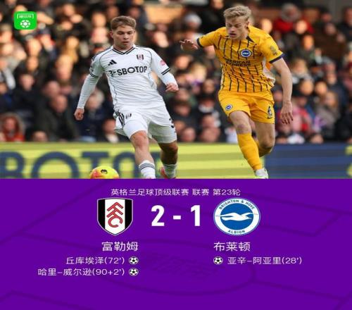 北京时间1月24日,英格兰足球超级联赛第23轮,富勒姆主场对阵布莱顿。亚辛-阿亚里率先破门,为布莱顿取得领先;随后丘库埃泽扳平比分;补时阶段,哈里-威尔逊完成绝杀。最终富勒姆以2比1战胜布莱顿。