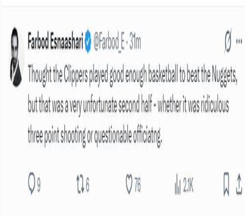 赛后船记Farbod Esnaashari继续吐槽,尽管快船队的整体表现还算不错但还是没能击败掘金,无论是球队一波荒诞的三分出手还是裁判那令人窒息的吹罚尺度。